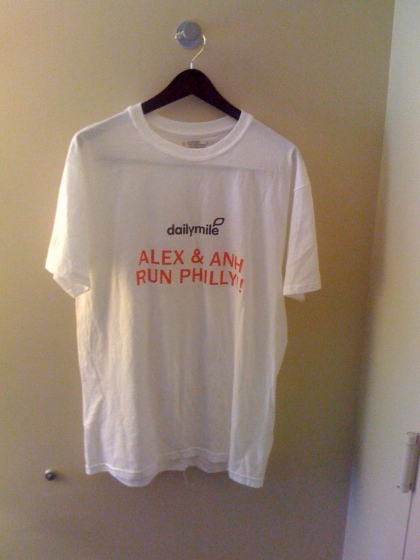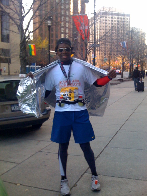 Wake up it’s your birthday. We’re up, It’s my birthday, but for what maybe the first time as far as I can recall, the bday is not the priority of the day, all I am able to focus on is the marathon, I am up 3 minutes before the alarm goes off. I get up and immediately go to my iPhone and logon to twiiter and see who else in the Philly Marathon world may be up, sure enough IronBrandon (BrandonsMarathon) is also awake, a recent twitter connection, who is also a podcaster, ironman, opera singer, I wish him a final good luck and started putting my gears together. Our fuel bottles were filled the night before, mine with Gatorade, Anh choose vitamin water “Power C”. Anh is also up making coffee and (peanut butter & banana) sandwiches, um.