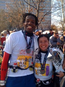 Mile 20-21: I also saw Anh, at about mile 20, tried to get her attention, but to no avail. Your beer is served! Smells good, but I am not going for it, not here, not now. Sounds of the “Eye of the Tiger” and “Gonna Fly Now” blasting from boom boxes, kept the adrenaline flowing. Also continued fan shouts of “Go Alex”, “You rock”, “Go Alex & Anh” (which was printed on my shirt as can see in the pics below), kept my spirits high. With amazement I also came across joggling runners? Yep that’s right, guess it’s a new thing, saw this runner, who I thought also dropped a ball, joggling balls along his run, up to mile 20, Manayunk, which is also a slight incline. Took some extra GU gels from the wonderful volunteers, at three fluid stations if in case I would need more and they weren’t available.