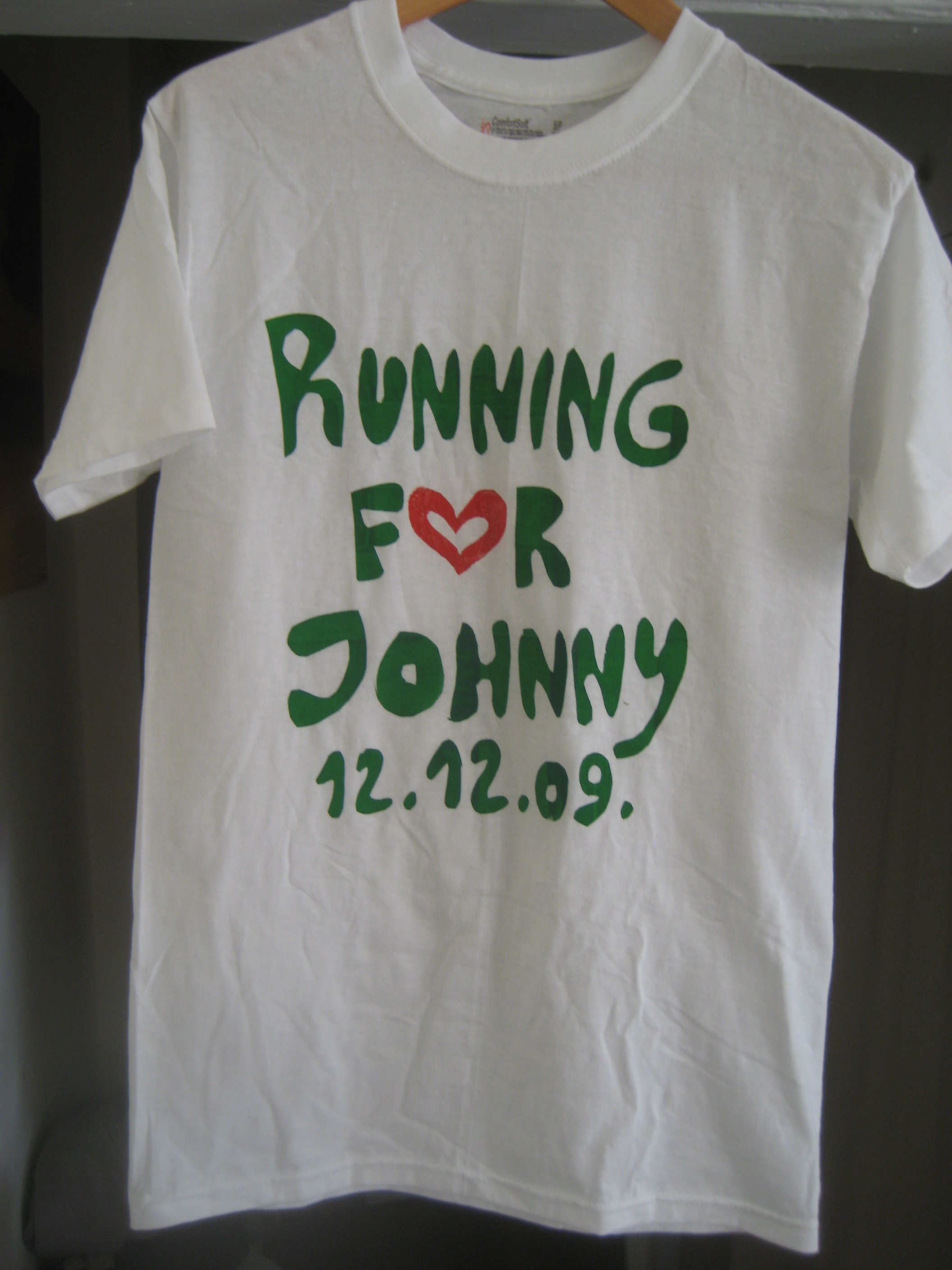 Since we began running this past February, Anh has occasionally printed on our race shirts. The prints are mostly in recognition of charities/causes that we may be representing or honorees. Anh’s latest print isΒ “Running for Johnny”. Johnny is a close friend, who has been diagnosed with pancreatic cancer. He is to face chemotherapy very soon. Anh, myself along with our friends decided to setup a race in his honor. The race will be held in Forest Park, Queens.Β It will be a 3 mile run/walk, start time 11am, Saturday December 12th, anyone reading this entry is free to join us in running for Johnny. Map.