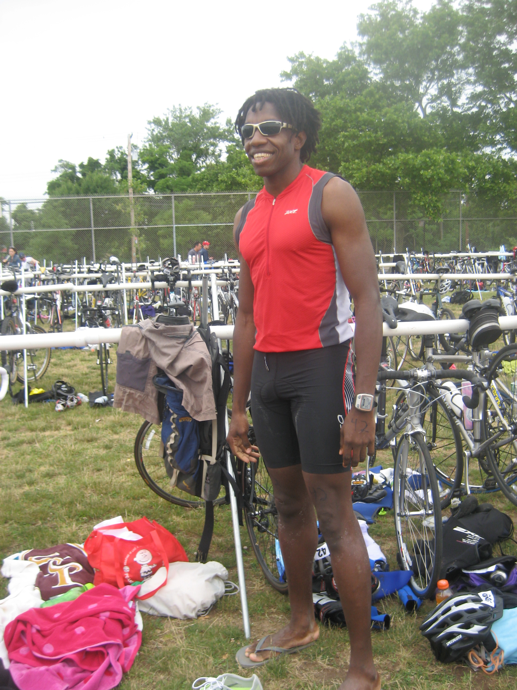 Bummer! Looking down at my Garmin 310xt I realized that it was difficult reading the screen. What could it be? Oh no. It’s the screeen. It’s cracked. I cracked the screen while removing my bike from the rack at T1. Mentally I’m going….it’s ok. Could be worse. Can always be worse. Let’s defer this mishap for later. Keep enjoying the rest of the race. I begin to hammer. The bike course was 12 miles (3 loops, 4 mile each) 2 miles out and 2 miles back. Going out to the 2 mile turnaround was a slight incline. I may have been complacent coming in thinking “flat as a pancake” no incline whatsoever…anyway it was not too bad at all. I tried to keep my speed at 17-19mph on that part of the course not trying to compromise my legs whatsoever for the run. The course was very bumpy. A fact that we were warned about during the 7:30am race meeting. During the entire bike leg I was riding super cautiously, just not to get any flat tire on such a short course. Averaged 22mph coming back from the turnarounds. At the end I finished the bike leg in 35 minutes. Dismount and off to T2. Helmet off, road shoes off. Race belt on, Nike Lunaracer+ on and I’m off.