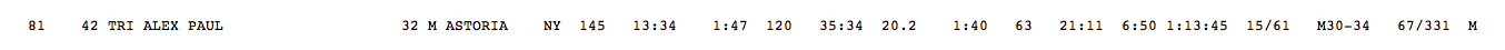 Overall Finish Time: 1:13:45 (81/577 triathletes)