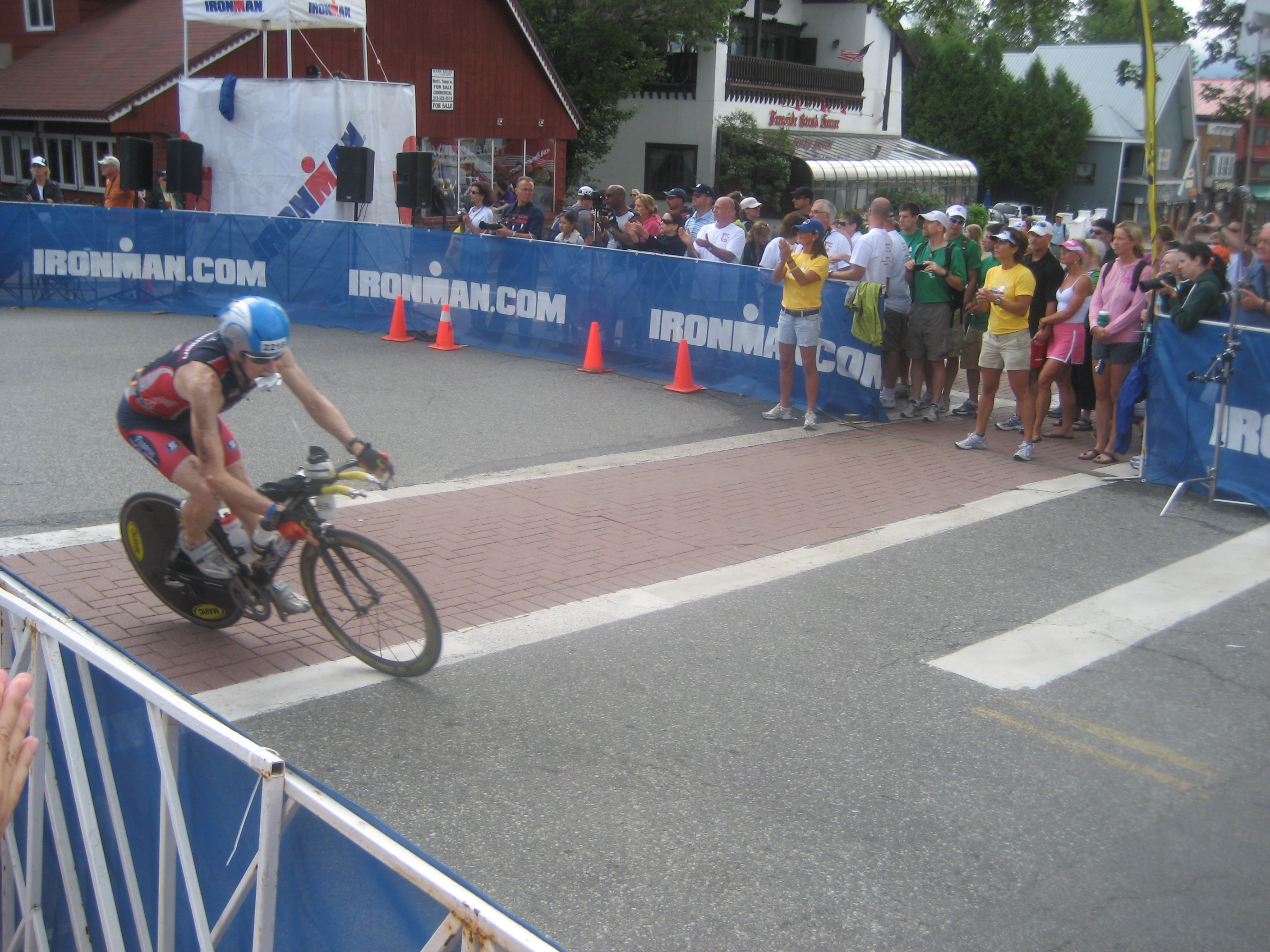 Saturday morning I went out for a long ride from our hotel (Super 8) in Warrensburg to the Chestertown, next town North. My bike route was along Route 9. I wanted to put at least a 40-50 mile bike ride in as per my Half Iron training, but encountered a flat tire at mile 15. Culprit a wired hook. After changing the tube I decided the best option was to return to Super 8, especially the fact that I didn’t have a patch kit or a 2nd tube (made a patch kit my first purchase when I returned to NYC). Also there wasn’t a bike store in sight of our hotel North or South. Anh also went out for a 4 mler that morning along Main Street. When we both returned, we showered, had some Dunkin’ Donuts breakfast from across the hotel and headed North to Lake Placid. Upon entering Lake Placid you know instantly why this venue makes for a great race. Rolling hills, magnificent view, what appears to be smooth roads (although I didn’t ride my bike on the course). We saw many triathletes training on the course.