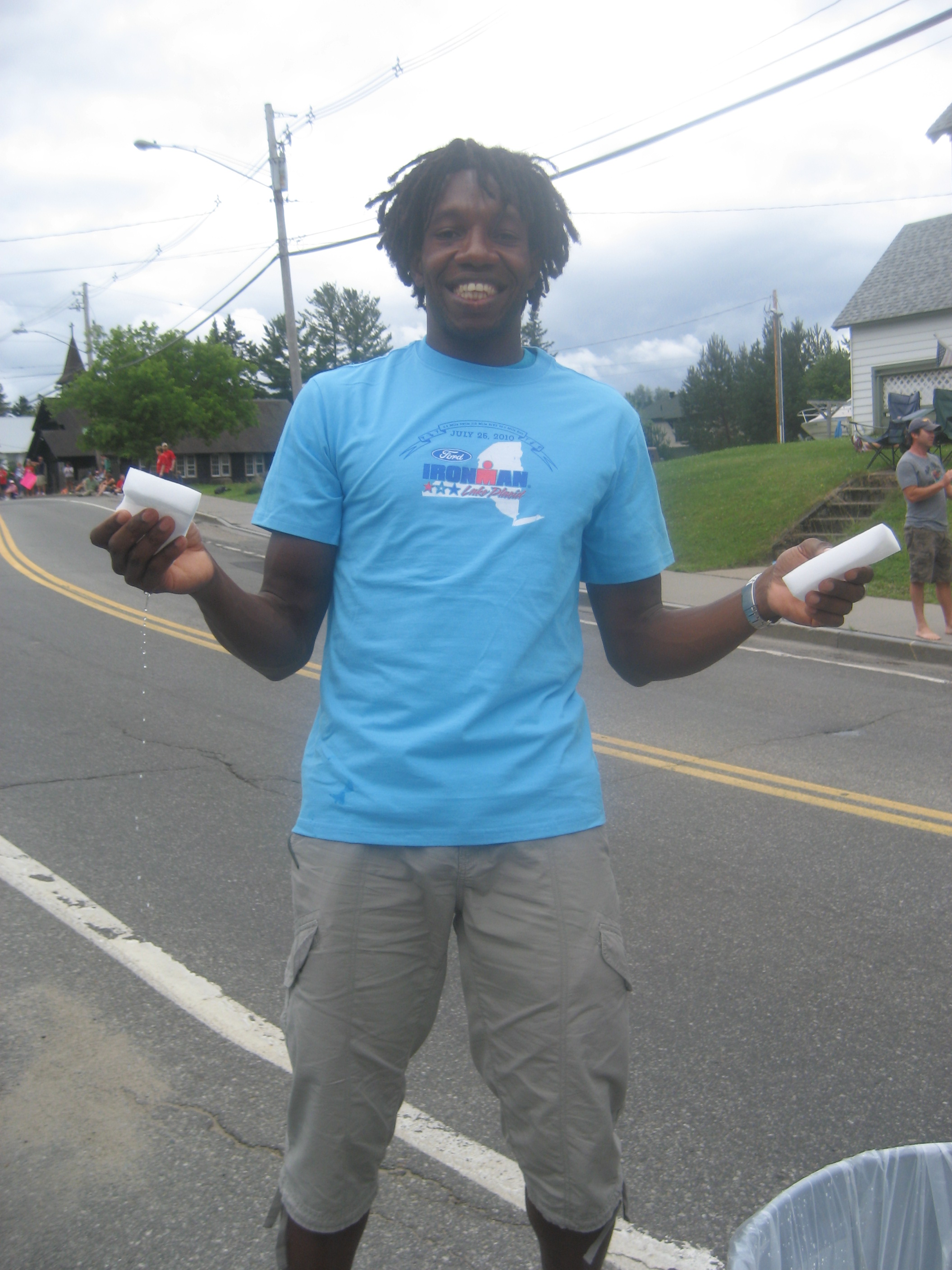 Sunday, race day. I did a long run in Lake George before we left for Lake Placid. We got to Lake Placid at 10:30am. We had some breakfast and met our volunteer captain. We were assigned “sponges”at our water aid station. Water aid station #1. The task was to hand athletes wet sponges as they run by to keep them cool. Earlier in the day around 1-2pm it was fine without ice in the water, but later when the heat emerged, ice would be a must. Our shift was from 12-4pm. So we would be able to see the Pros start and finish the run. This is the first triathlon I’ve spectated and not participated in, had a bit of tri/IRONMAN envy at some points. It was fun to cheer the participants on. Hand them sponges to cool off. Ice when needed. Anh was having the most fun. She cheered the hardest for the athletes. I remember seeing her red palm and going, baby, maybe clap a bit softer? lol The shift went quick because you are so engaged, working your shift, supporting the athletes, having conversations with fellow volunteers, who most of which are signing up for next year’s race as well. We saw Amy March, the female winner run to the finish. We may have missed the male. I saw John Hirsh, who I am following on twitter pass by. He finished 19th overall, 12th in the pro division.