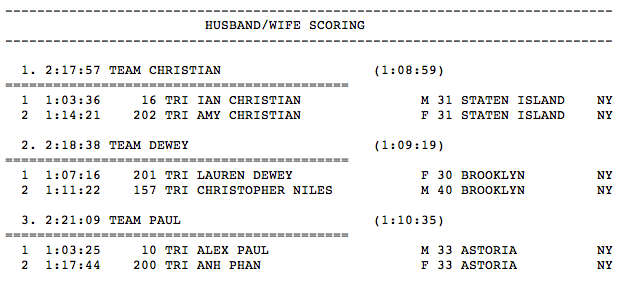 Great day for racing and thanks again to all the volunteers. Content as always with improvement clauses especially in transition. I PR’d the course by 10 minutes over last year. Race goal met! Again as I noted last year. I would recommend this race as an open water sprint to kick start the season for sure. Anh and I registered in the Husband/Wife category and placed 3rd. That was a great Tri performance on her part, especially being her first open water tri ever. Great job babe!