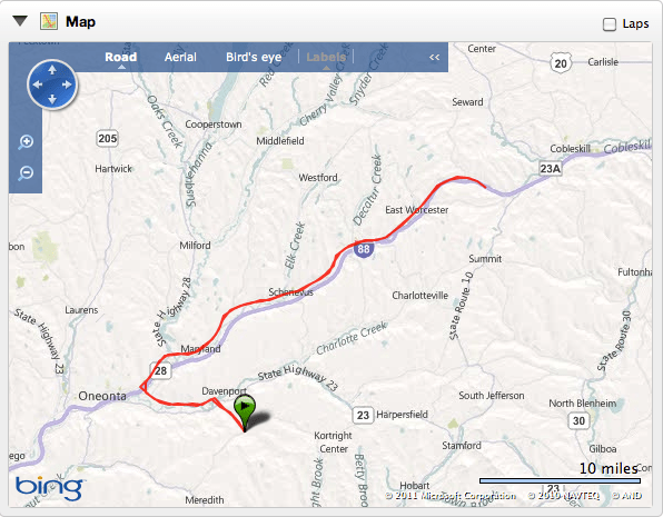 I biked from East Meredith, NY to Richmondville, NY. The duration of this ride was right around 4 hours. My training was to ride about 4:30, but this was very satisfactory as there were practically no traffic lights compared to a city ride. This was a huge plus to being a race simulation ride. I biked using my tri gear and felt great. There wasn’t any discomfort. Nutrition was great as well. I packed enough gels, etc to fuel my ride. Finished mileage was 73.54 miles. Transitioned to my run gear afterwards.