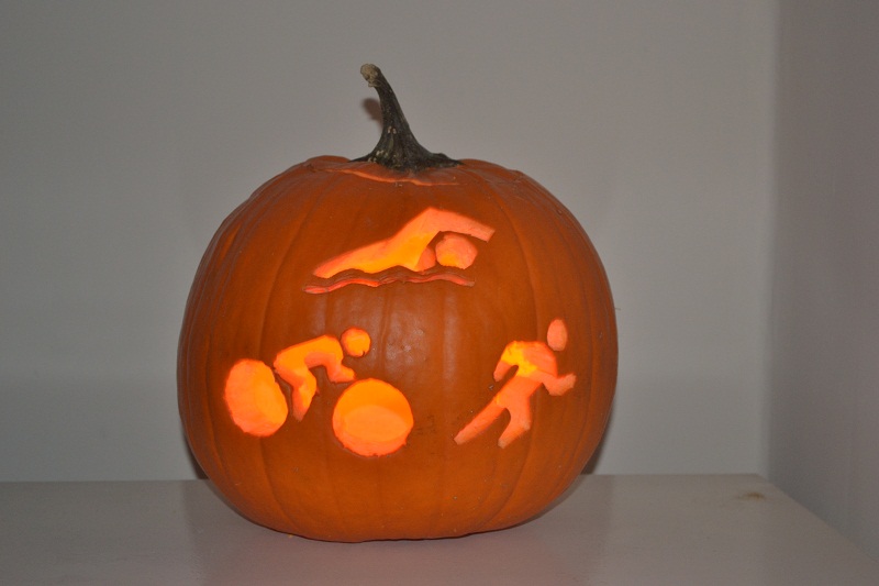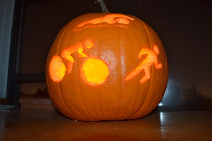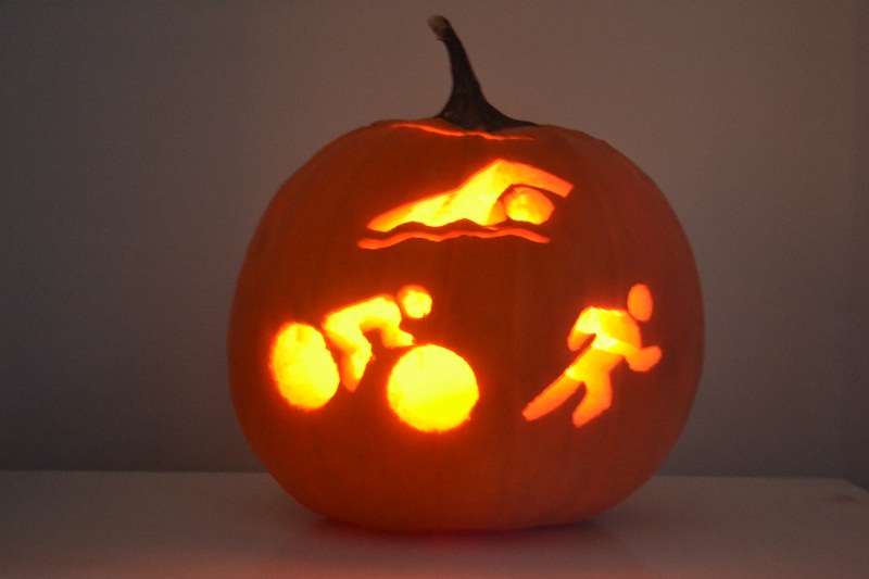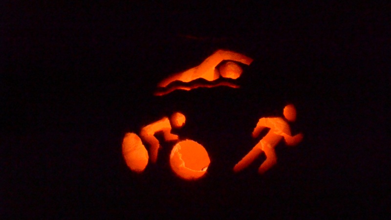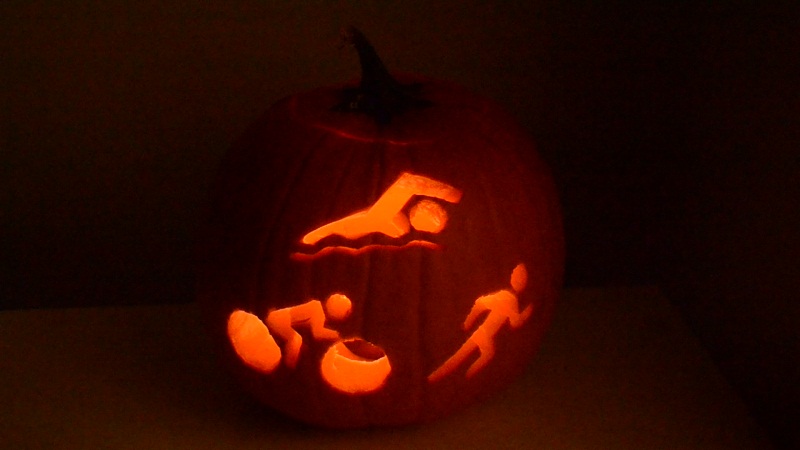 This pumpkin was carved by Anh and myself. First time participating in any sort of pumpkin carving :-). We picked out a perfect size and shape pumpkin a few weeks ago and finally carved it today. It was carved using a utility blade, kitchen knife and wooden bamboo skewers. Being that we both are triathletes and I completed my first IronmanΒ this past July, this theme felt appropriate. Happy Halloween from us.