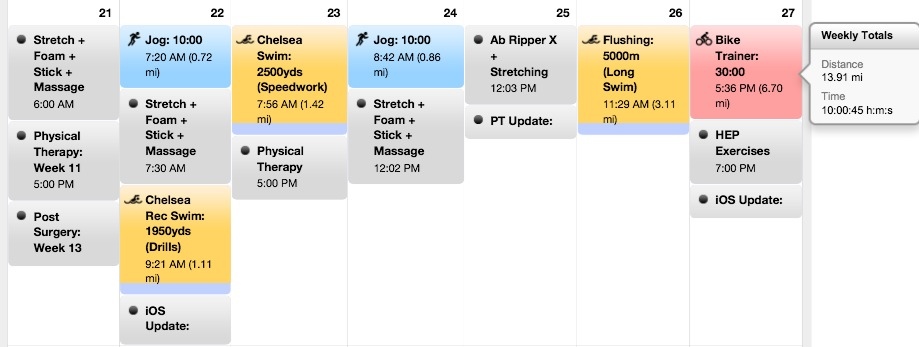 I had two out of three therapy sessions this week. Cancelled Friday post thanksgiving. Monday was a tough day. I was exhausted heading into therapy after a long work day. A project was due for completion this week and I worked to make it happen. I was able to put two jogs in this week along with three swim sessions. I topped the swim off with my first ever 5k swim. This was very rewarding and solidified my swim endurance is back. On Sunday I did a full HEP program which included a 30 minute trainer ride. Knees felt good and not sore during the ride. Knees are also feeling much better during the 10 minute jogs. The PT said that next week the jogs will be bumped up to three sessions.