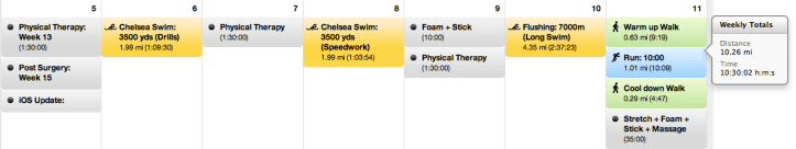 This was a great week in recovery. Though knee has a bit of inflammation left it feels 75% back to normal. Walking down stairs is easier as a result of less soreness. I was able to have an outdoor run, first run since the injury with very minor pain – progressed from doing 12 min/jogs to nailing this 10 min/mile run. I also did a 10 minute jog in every PT session last week on the treadmill with practically no pain. This is also due to the fact that it’s a softer surface compared to asphalt or concrete. I was able to resume swimming after taking a week off from a severe cold and nailed a 7k long swim on the weekend. After the swim I made sure to observe the knee for any aggravated swelling or discomfort. There wasn’t any. If anything knee felt much better being in the pool for two and a half hours.
