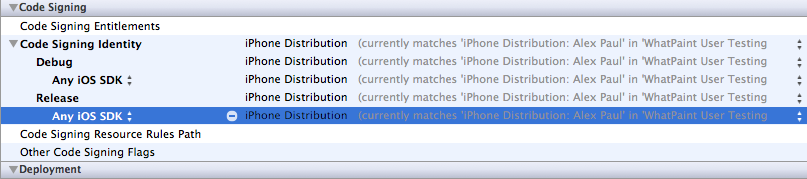 (4) Go to Build Settings and under Code Signing make sure to use iPhone Distribution making sure it points to your downloaded Profile