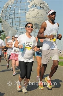 Anh is getting closer to fulfilling her 9 races to qualify for the 2013 New York City Marathon and it was my pleasure to accompany her on this run. The race venue was Flushing Corona Park. We ran a very slow paced run given her pregnancy and the heat conditions. We kept the pace in the high 11’s per mile. Sprinklers were available to runners throughout the course to cool down. I choose to hold a 20 oz bottle and kept wetting my arms and head to keep cool. The day before I was okay using the sprinklers at the Sprint Triathlon because I had no socks on. However I avoided them at the 10K because with socks there is a higher probability of getting blisters.