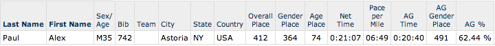 The Percy Sutton 5K was held in Harlem as part of Harlem Week celebrations. This was a solid 5K course with a challenging hill early on with some flats and a steep incline (which I slowed down on) later towards the finish. Prior to the race I did a 14 minute easy warmup and stretched as well. Throughout the race I ran a controlled hard effort race playing close attention to my knee response.