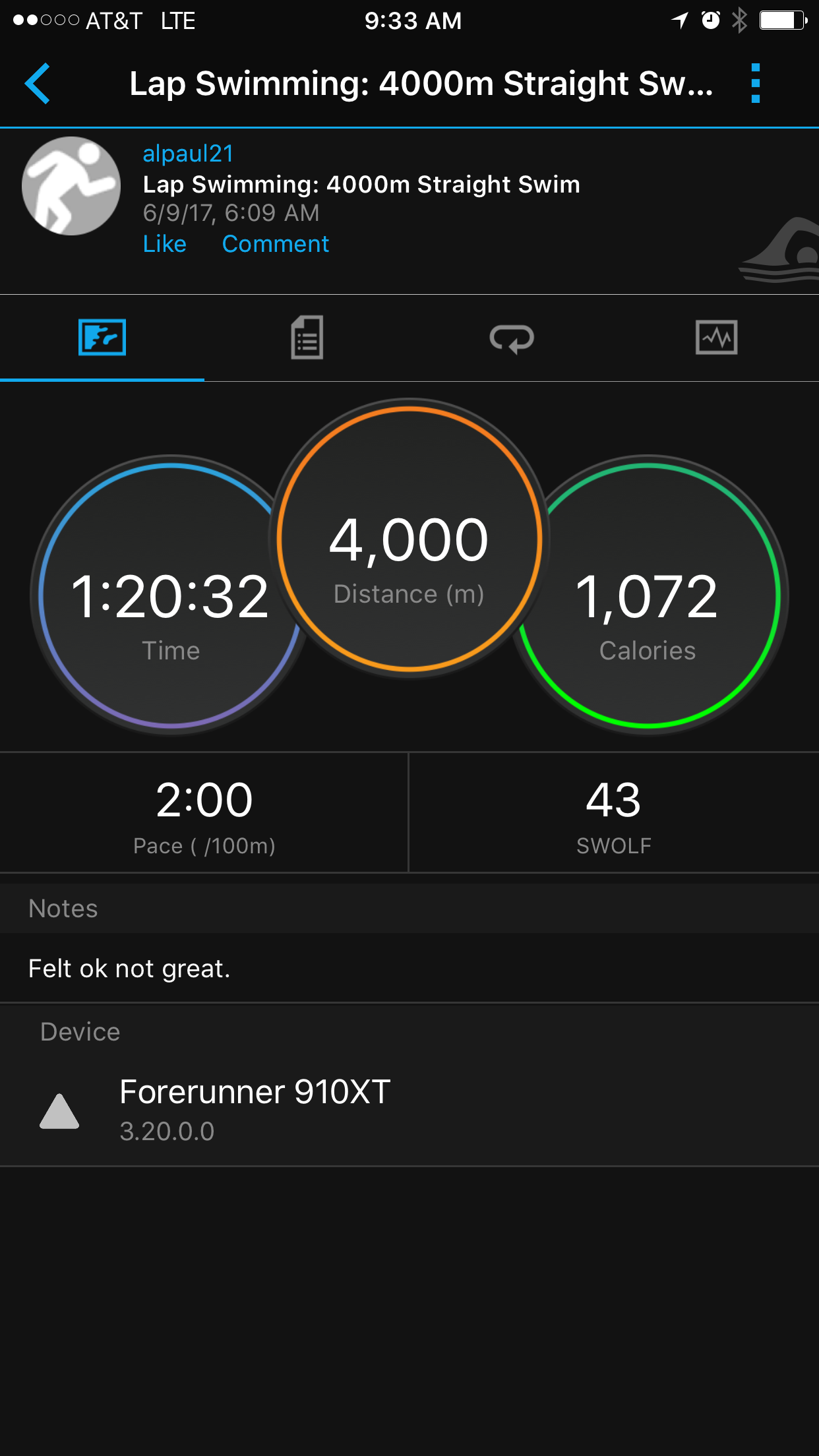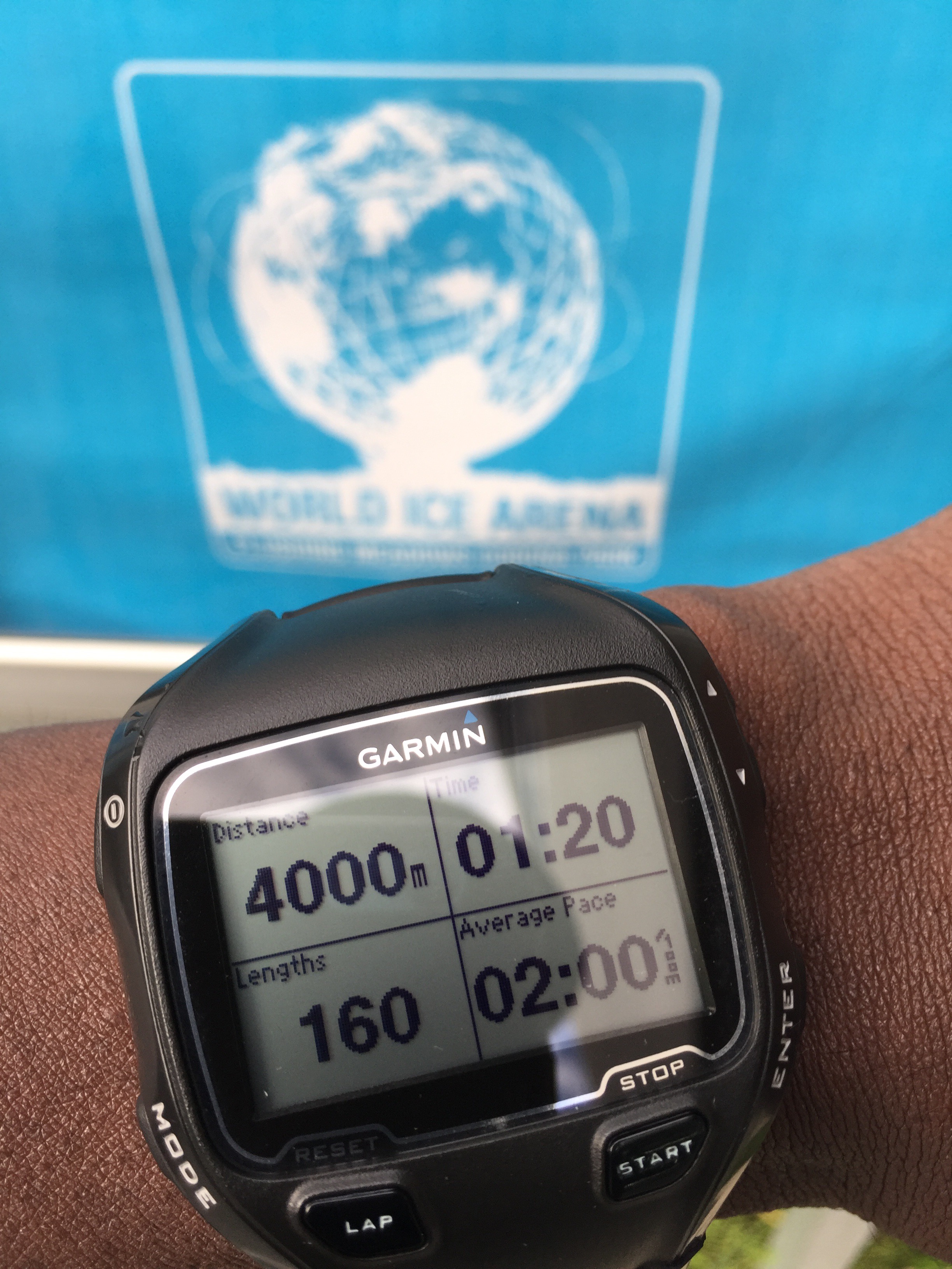 On the previous 4000 meters straight swim my pre workout fuel was a bagel with peanut butter and banana that may have been a better fuel choice as opposed to the option of cereal and banana today. Still the 2 minute difference could just be the lack of consistency and speed sessions.
