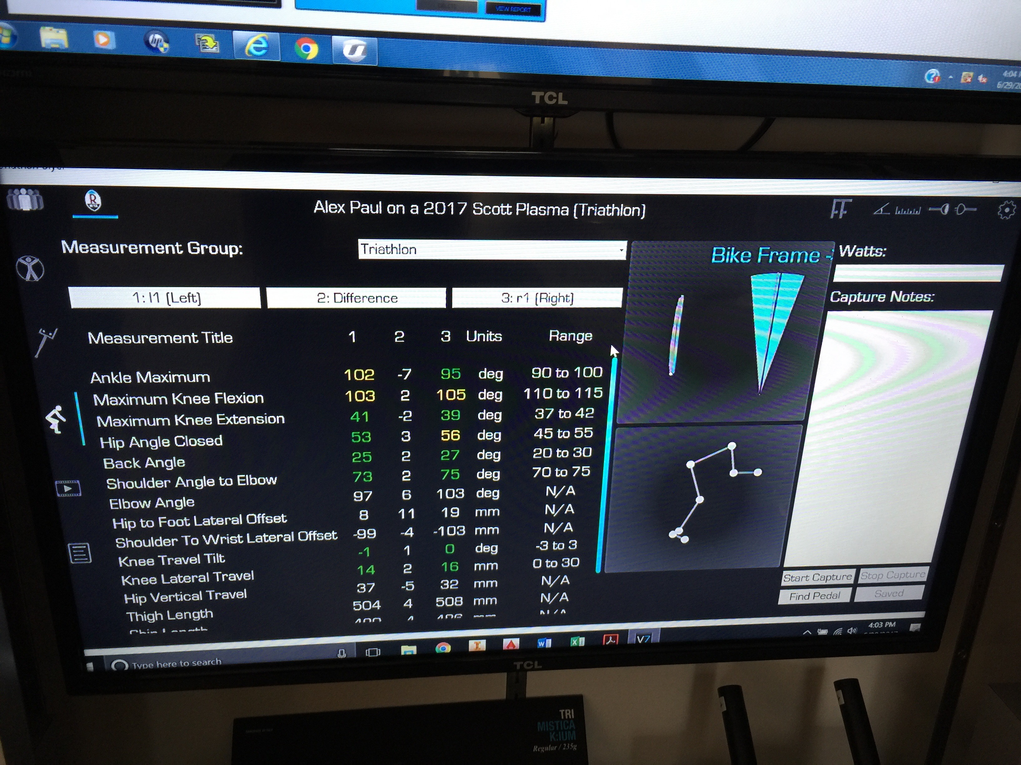 Moving on to flexibility. Did you know that my left leg is longer than my right? You may be too. But yes that’s my case. That fact got reflected in the motion capture numbers. After doing some table exercises flexibility routines, bridges, etc. Jon had me walk back and forth to test pronation. He then adjusted my shoe clits to align more parallel in the pedal stroke. The bottom line my flexibility is pretty good which could be why I rode such a short saddle height without injury.