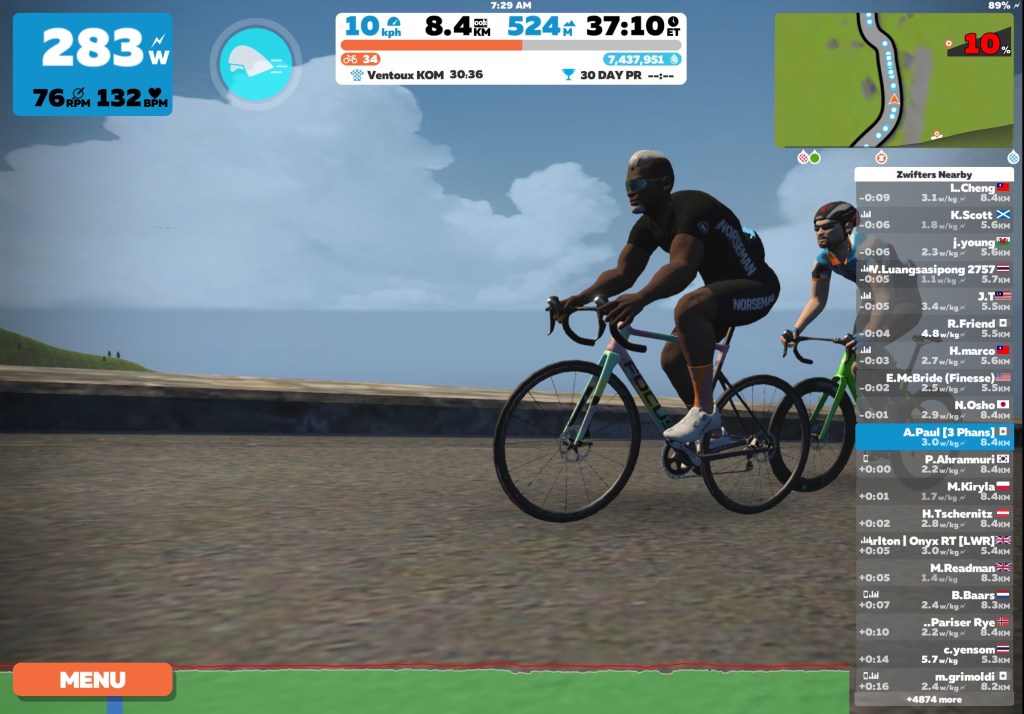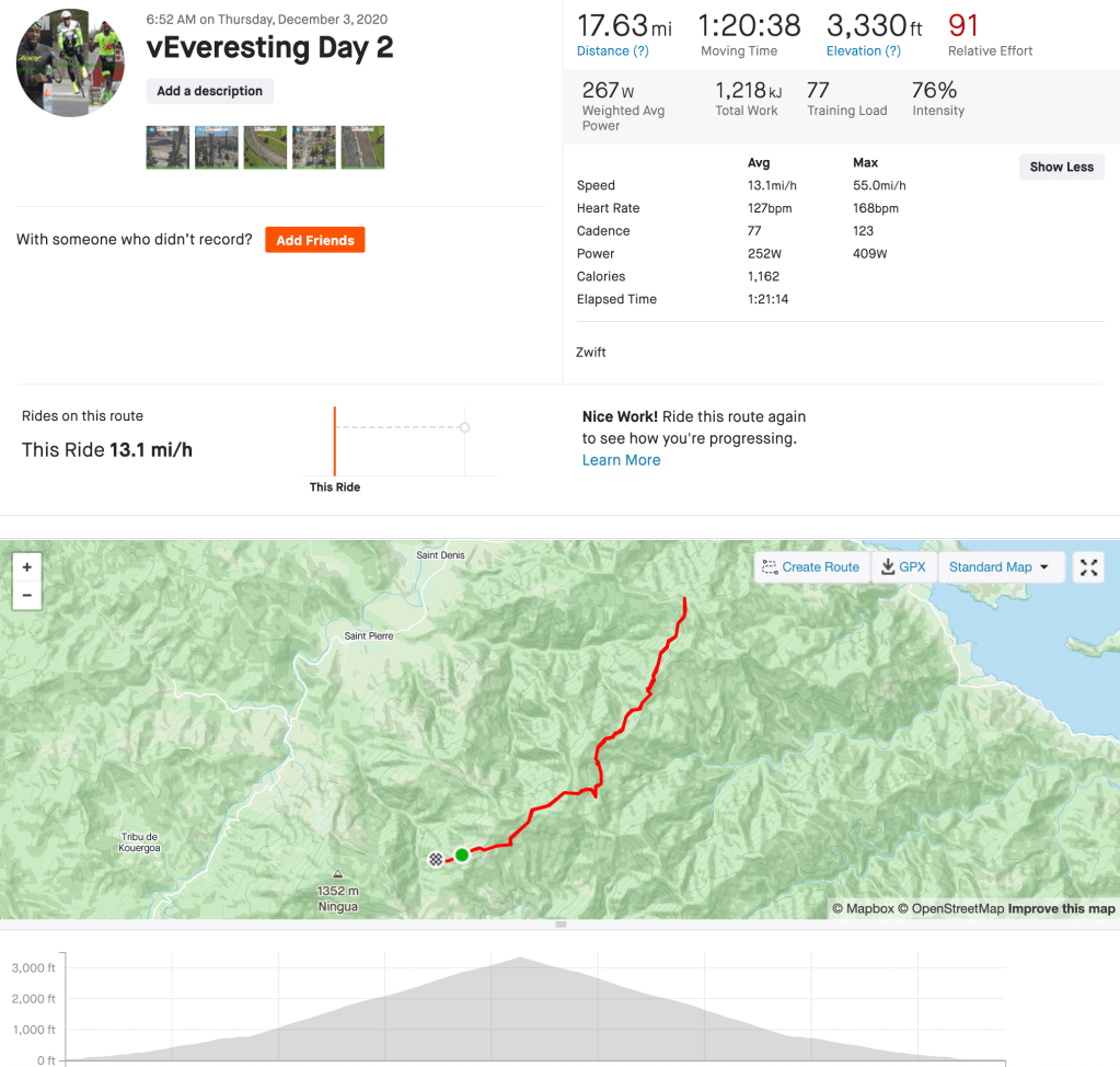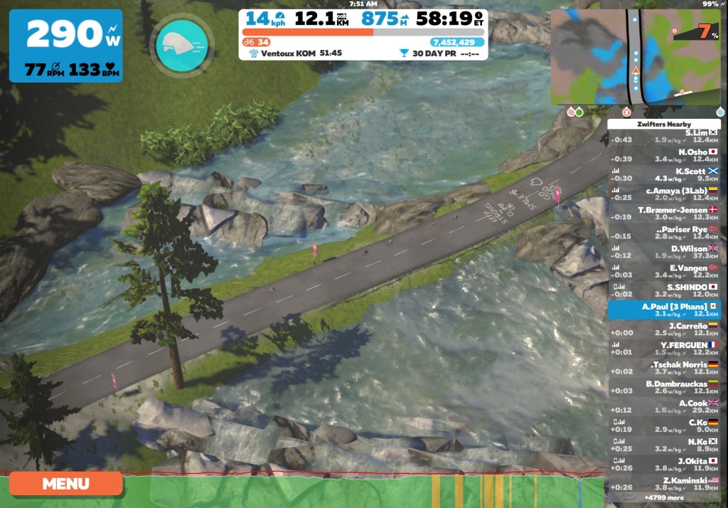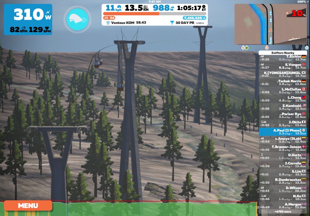 Today on Zwift I biked some of the Ven-Top course in France. This course navigates up towards the top of Ventoux KOM. I climbed about an hour of Ventoux KOM for an elevation gain of 1000 meters and made a U-turn to head back down whilst cooling down to end the ride.