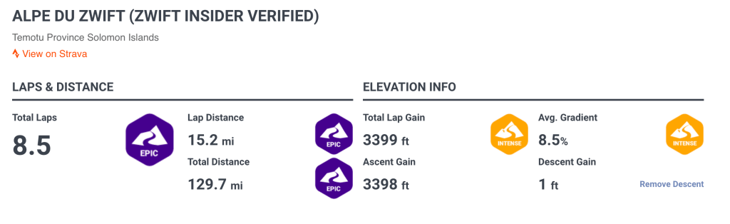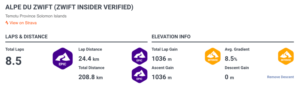 Using the Everesting Calculator for the Alpe Du Zwift course (segment id 17267489) equates to doing the climb 8.5 times π¦΅πΎπ±π¦΅πΎπ±π¦΅πΎπ±π¦΅πΎπ±