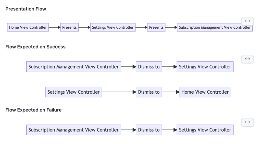 In this demo app on success, we want to dismiss the flow to the Home View Controller. On a failure, we simply want to navigate back one step. Here we are using MVC to keep things simple but for your own use case, it can be any architecture you or your team are using.