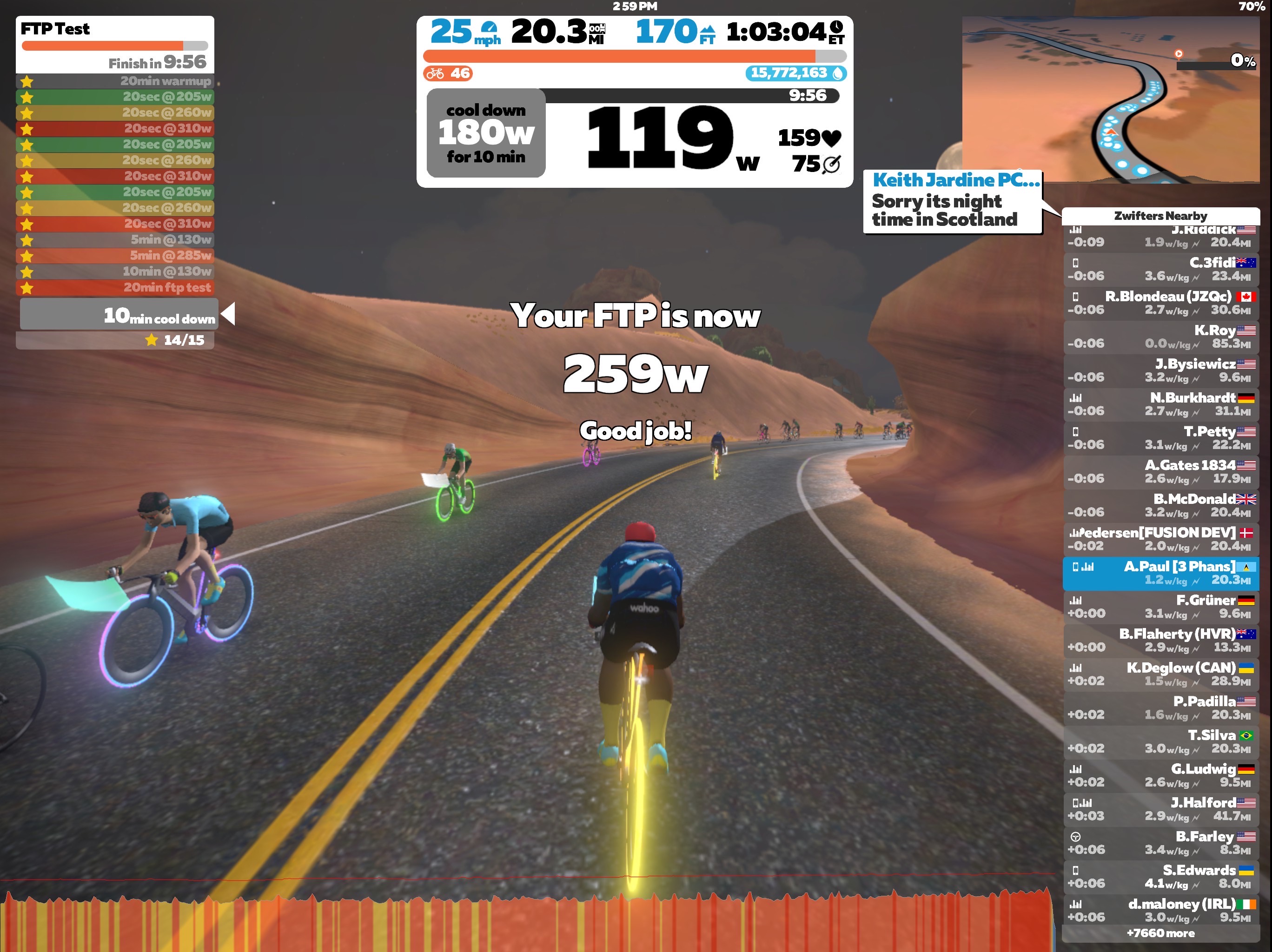 Today I decided to do a Zwift FTP test to evaluate my current bike fitness. The final FTP number was 259 watts which I am very happy with. This gives me a great benchmark for my FTP zones as I continue to kick off my training for IRONMAN Copenhagen in August.