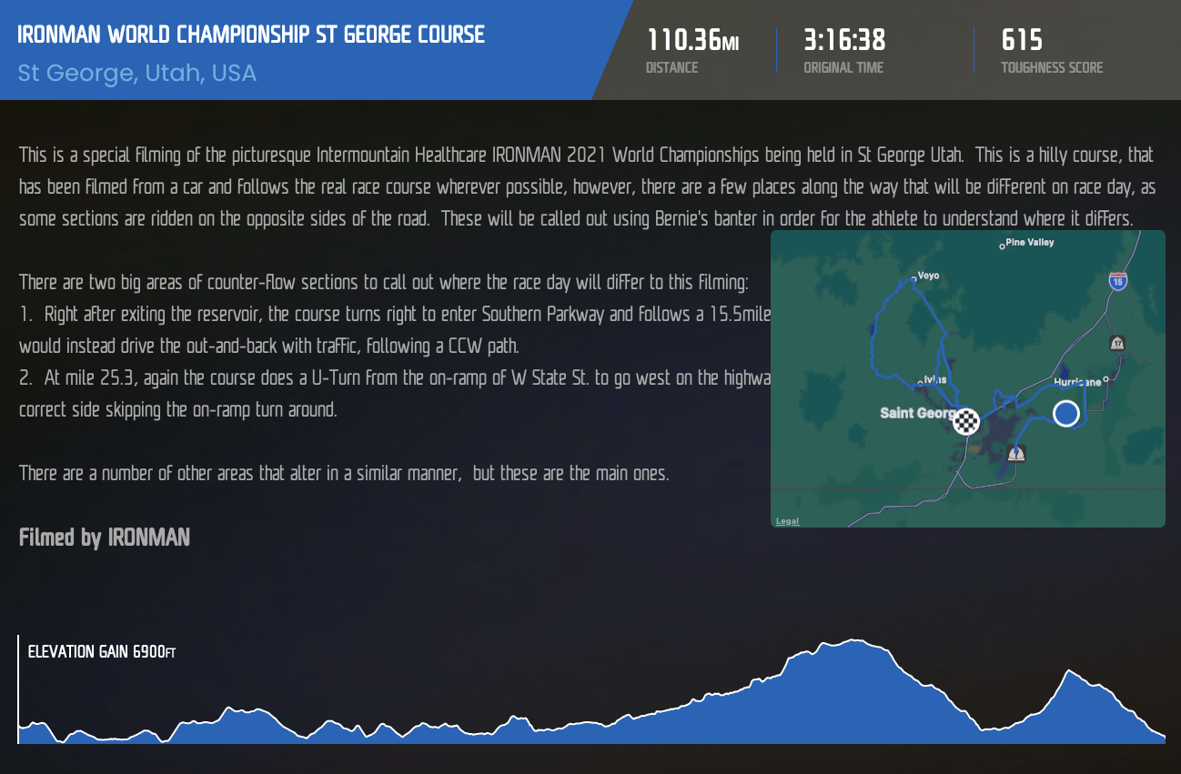 This IRONMAN Championship Saturday, May 7th, I’m set up to ride the course virtually on Fulgaz π΄πΎ π . St. George on Fulgaz has a total elevation of 6900 feet vs Lake Placid at 6100 feet (Lake Placid is my most challenging IRONMAN course to date, the finish time at IMLP will be a benchmark time for this event).