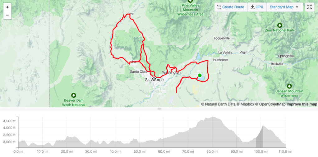 In my recent FTP test, my watts/kg is 2.8. The goal of this ride is to hold a steady effort of ~ 220 watts / 2.3 w/kg on flats and climbs (don’t think that will be the case up Snow Canyon).