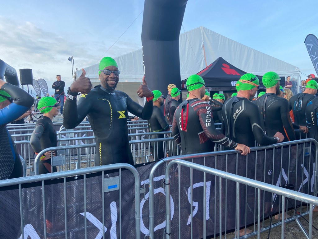 At the swim start, I opted to not run into the water but just again manage my Achilles, so I casually walked into the water for the swim.