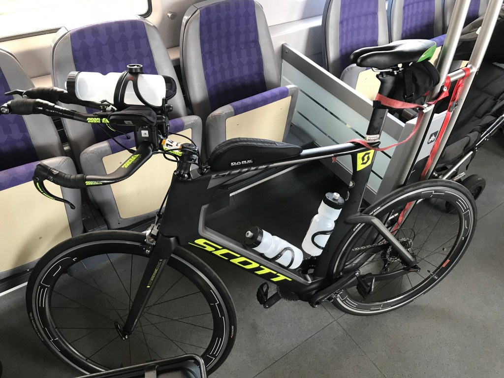 In transition, I put on my compression socks and my ankle brace over the socks and did not attempt to tinker trying to put on KT Tape for my Achilles (I’ve tried KT Tape multiple times only to have it come off from my high sweat rate). I definitely wasn’t aiming to rush out of T1 as with 112 miles of biking ahead I needed to make sure I had all the right pieces in place for a successful bike and Achilles-free pain as much as possible. My arm warmers were already on during the swim so I kept them on as it would be a bit chilly in parts on the bike as I did find out from the countryside winds.