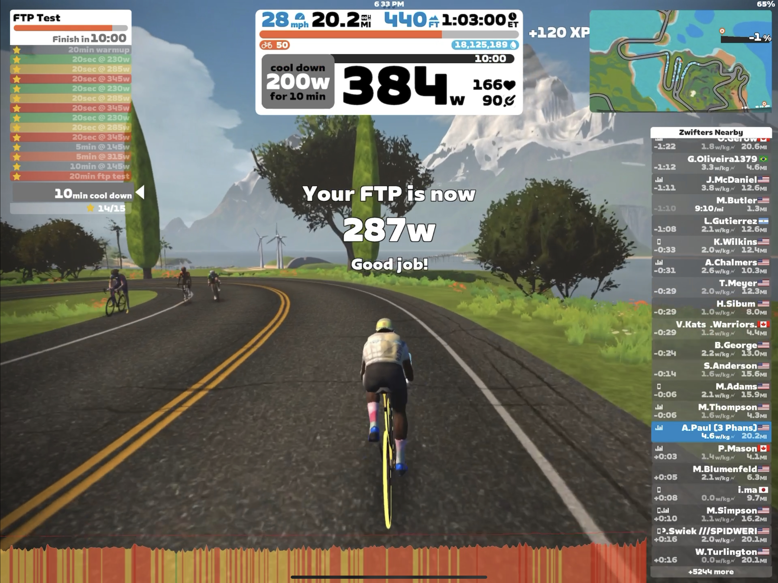 My prior FTP coming into this test was 259 watts. I gained an additional 28 watts from my last FTP test almost exactly a year ago. Psyched about my FTP being at 287 watts as I continue my IRONMAN Nice training.