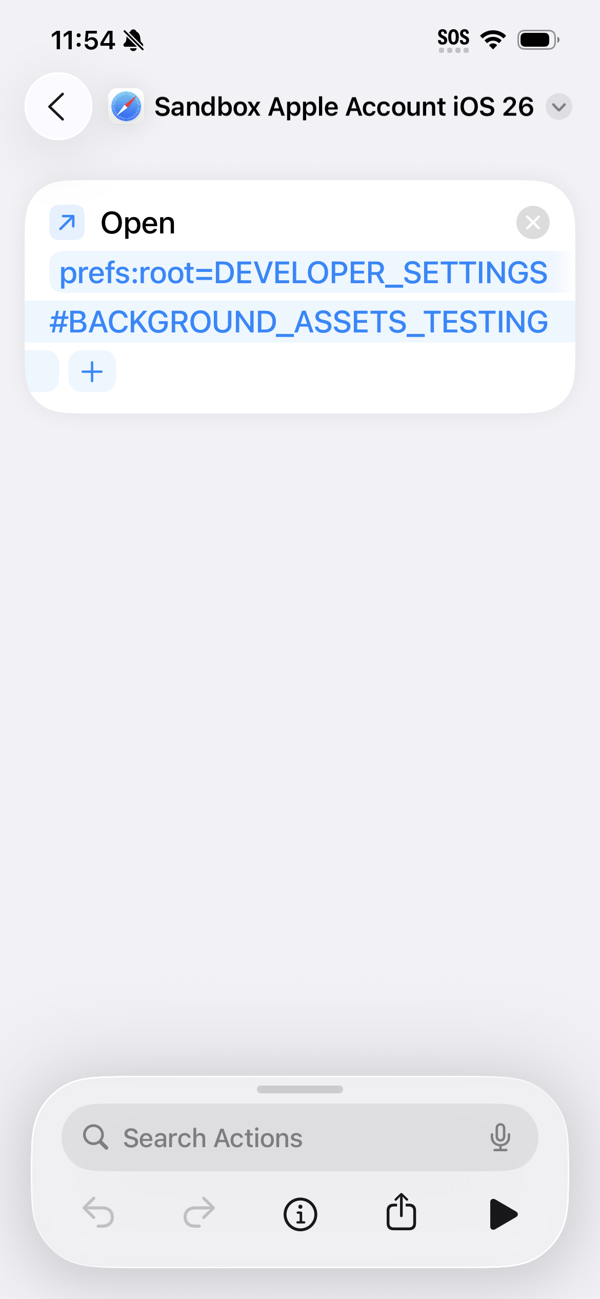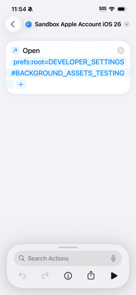 iOS 26 Apple Sandbox Account Shortcut. At least the closest I got, if anyone has a better solution please feel free to add it to the comments.
